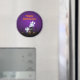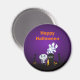 Un aimant amusant éffrayant avec un design d'halloween déplaisant. Dans un cimetière sombre et effrayant. Une pierre tombale dit RIP, avec une bougie et des crânes brillants sur le sol. Une vieille clôture grinçante se penche sur le côté. Un adorable squelette souriant brille et des fantômes à l'air cool tourbillonnent dans l'air. Placez-vous sur un arrière - plan dégradé noir et violet. Le texte dit heureux halloween mais peut être personnalisé pour dire ce que vous voulez.