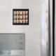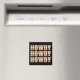 Style rétro cowboy "Howdy Howdy Howdy" design de texte avec des lettres rayées dans les couleurs jaune, rouge et beige