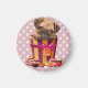 Petit chiot en carlin mignon dans un contenant à bonbons, avec des pops et de la réglisse sur arrière - plan violet dessiné par l'artiste Maryline Cazenave.