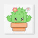 Adorable bébé cactus vert avec un mignon visage kawaii souriant, une fleur rose et jaune et un coeur d'amour rose à l'intérieur d'une bulle vocale. Il est assis dans un pot de fleurs, les bras dehors pour les câlins.