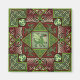 Un dragon stylisé se trouve au centre d'un labyrinthe de nouages celtiques rouge et vert olive. Le dragon est-il piégé au centre ou est-il le maître du labyrinthe ?