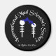 Aimant noir avec sceau "International Mad Scientist's Society" en caractères blancs, avec étincelle fractale bleue et devise latine "En Rabies Est Vox" (Dans la folie est le pouvoir)