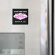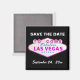 Un mariage moderne Save the Date aimant pour un mariage de destination Las Vegas. Il affiche le célèbre signe néon et le texte "Bienvenue à Fabulous Las Vegas, Nevada". Couleurs : rose fuchsia, noir, bleu. Certaines parties sont gracieusement fournies par anasofiapaixao.