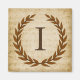 Une délicate couronne de laurier est posée sur un arrière - plan vintage de partitions de style romain classique. Ce design est personnalisé avec le monogramme "I" dans une tonalité de sienne riche.