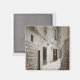 Aimant photo souvenir de laverie composée de couvertures blanches suspendues au soleil sur la façade d'une maison en pierre blanche dans une ruelle avec escaliers en grès dans une ville en Italie, créant une vue typique de rue italienne/méditerranéenne.