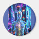 Une forme humaine brillante se dresse sur fond de gratte-ciel futuristes, avec des couleurs vives et des points d'énergie illuminant différentes parties du corps. Le paysage urbain high-tech reflète les néons, créant une atmosphère dynamique et énergique. Photoshop Art numérique CS5