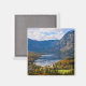 Aimant photo souvenir avec un ferry sur le lac Bohinj approchant la ville de Ribcev Laz avec l'église proéminente dans un paysage d'automne avec des forêts avec des arbres aux couleurs de l'automne dans le parc national de Triglav près de Bled en Slovénie.