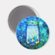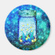 Un pot de mason de lucioles ou d'éclairs contre un arrière - plan étoilé. Un design rustique et élégant. Dans les couleurs bleu, vert et jaune.
