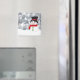 Joli petit bonhomme de neige qui brille au soleil. Écharpe rouge, chapeau noir et boutons verts.