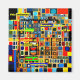 Un motif géométrique vibrant, rempli de carrés et de rectangles colorés, est superposé à une phrase intrigante composée de mots dans diverses polices et couleurs.