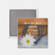 Donnez un ton décontracté et rustique à votre cérémonie de mariage à la ferme ou au ranch et à la réception avec la charmante White Daisy and Horseshoe Country Western Wedding Save the Date Carré Magnet. Ce thème hippique personnalisé, décontracté mais classe, garde l'aimant dateur présente une photo florale pittoresque d'une fleur marguerite blanche, fer à cheval rouillé, collier de perle et voile de mariée blanc avec un arrière - plan de grange patiné marron.