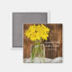 Annoncez vos nuptiaux décontractés mais classe à thème de ferme ou de ranch avec le charmant Mason Jar et Jaune Daisies Pays Mariage de grange Enregistrer la date Magnet Carré. Cet aimant rustique chic et informel et élégant garde le dateur avec une photo fleurie originale numériquement rehaussée d'un bocal en verre rempli de fleurs de marguerites jaunes et d'un arrière - plan en bois de grange patiné brun.
