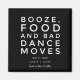 Magnet Réservez la date moderne et élégant pour le couple amoureux qui ne peut pas attendre d'annoncer sa date de mariage à sa famille et à ses amis. Design de typographie noir et blanc qui dit : Booze, nourriture et mauvais mouvements de danse. Customisez avec vos noms et votre date de mariage.