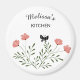Aimant rond de 3 pouces avec design minimaliste de fleur rose et papillon sur arrière - plan blanc.