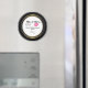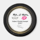 Un aimant mariage au design mariage moderne - des lèvres kissy roses glamour et une illustration de moustache d'apparence rétro masculine. Placez-vous sur un arrière - plan en damier noir avec un cadre circulaire en dégradé doré au centre. Texte dit M. et Mme et vous pouvez personnaliser avec vos noms et date mariage.