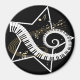 Unusual musical design featuring swirling piano keys with gold musical notes flowing from the centre of the keys on a black star. This design would make the perfect gift for the piano lover and is available on a collection of toxiques and paper products. sgb01