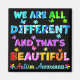 Citation inspirante de "Nous sommes tous différents et c'est magnifique" avec des puzzles d'autisme uniques, et des papillons colorés volant sur l'arrière - plan pour soutenir et défendre la Sensibilisation sur l'autisme.