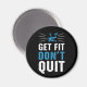 Ce design présente le texte typographique moderne "Get Fit Don't Quit" en blanc et bleu avec un vélo tournant au-dessus du texte. Parfait pour ceux qui aiment la salle de sport avec une citation motivationnelle.
