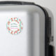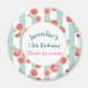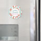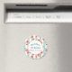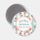 Un aimant d'anniversaire avec une image numérique avec un motif répétitif de pamplemousse rose créé avec des aquarelles, posé sur un motif rayé vert pastel et blanc. Un cercle blanc avec une bordure en or tient votre texte customisé.