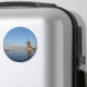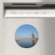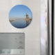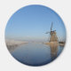 Aimant photo rond avec un paysage à la campagne dans la Pays-Bas en hiver avec un moulin à vent, glace sur la rivière et roseaux gelés sous un ciel bleu clair.