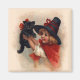 L'art vintage enchanteur présente une petite sorcière en casquette noir pointu et cape rouge avec son chaton noir mignon. Un texte Halloween heureux peut être customisé par vous.
