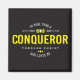 "Plus qu'un conquérant" badge de design de typographie chrétienne. Tapez dans le style emblème avec des lettres jaunes et noires, "Je suis plus qu'un conquérant à travers le Christ qui m'aimait." La référence de l'écriture est de Romains 8:37.