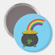 Illustration dessinée de la casserole d'or à la fin de l'arc-en-ciel avec feuille de shamrock verte pour la célébration de la Saint Patrick. Ce chaudron plein de pièces d'or design est une idée cadeau pour les amoureux du thème irlandais et les amateurs de trésors irlandais. Prenez le leprechaun et obtenez son or !