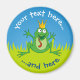 Caricature de la grenouille Prince avec couronne sur herbe verte sous ciel bleu. Deux champs de texte personnalisés sur cercle.