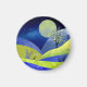 Un paysage abstrait représentant des collines ondulées avec un arbre printanier fleuri et des plantes et une lune et des étoiles dans les tons bleu, cyan, jaune et rose.