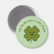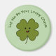 Cute green cartoon four leaf clover with small black dots for eyes and a big happy smile. A curved text template reading "Let Me Be Your Lucky Charm" is above the leave and can be used as it or change d to your own text.