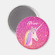 Rainbow Uniçorn Parties scintillant rose étincelle L'aimant personnalisé est conçu avec un arrière - plan rose vif et or faux parties scintillant brillant et une jolie licorne blanche au centre. La licorne a des cheveux arc-en-ciel et des fleurs. Personnalisé avec le nom en calligraphie blanche script en lettres sur le dessus. Fait une grande fête d'anniversaire à la licorne en faveur ou une idée cadeau pour toute occasion. CLIQUEZ SUR L'OPTION PERSONNALISER LE MODÈLE ET ENTREZ LE NOM