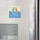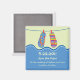 Amusant et moderne enregistrer la date aimant avec un thème de plage. Idéal pour un mariage de printemps ou d'été. Idéal pour une plage ou un mariage extérieur. Comprend des tongs avec différents motifs accrochés à une ligne de vêtements et des vagues de l'océan au fond.