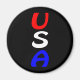 "USA", l'abréviation des Etats-Unis d'Amérique, en lettres rouge vif, blanches et bleues contre un aimant noir.