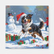 Illustration de vacances pleine de charme avec un chien gai jouant dans la neige, portant un chapeau de Père Noël et entouré de boîtes cadeaux colorées. Dans l'arrière - plan, les enfants construisent un bonhomme de neige à côté d'un sapin de Noël enneigé, créant un merveilleux pays hivernal. Parfait pour répandre la joie des fêtes et capturer la magie de Noël.