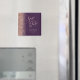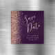 Le bord gauche de cet élégant aimant Save the Date comporte une bordure de parties scintillant en or rose. Le texte personnalisable combine un script d'écriture manuscrite rose rose avec une police serif sur un arrière - plan violet.