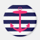 Une silhouette rose néon d'une ancre est sur un arrière - plan rayé bleu marine et blanc. Un design nautique amusant.