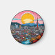 Représentation artistique de l'horizon d'une ville de Séoul avec ses bâtiments traditionnels, ses éléments modernes, son coucher de soleil animé et son environnement pittoresque. L'illustration exprime la richesse culturelle, la diversité architecturale et une atmosphère inspirante.
