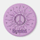 The sun and the symbole for peace celebrate your birth month in lavender, lilac, and purple with stars.