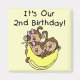 Trois petits singes, deux filles et un garçon, et une grande banane jaune sur les T-shirts Triplets 2e anniversaire, costumes, sacs fourre-tout, cartes, autocollants, magnets, et bien plus encore.