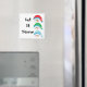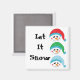 Trois visages de bonhomme de neige avec un gros grain et un nez de carotte. Un avec une toque rouge, un en vert et un en bleu. Dit : Laisse-le neiger !