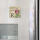 La tulipe violette et jaune de style botanique s'associe à la musique vintage en feuille dans un style victorien classique. Cette conception inspirée de la découpage est personnalisée avec le monogramme "R" sur un arrière - plan de parchemin âgé.
