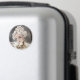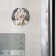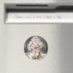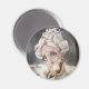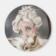 femme aux cheveux blancs tenant une poule derrière le rideau de cirque