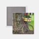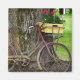 Une photo en couleur montrant un vélo vintage avec sa belle patine rouille, penché contre un arbre rongé dans la cour avant de quelqu'un. Une corbeille sur les guidons contient de jolies fleurs. Customisez n'importe quel article avec votre propre texte ou profitez comme indiqué.