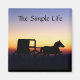 Une silhouette d'un cheval Amish et buggy se déplace à la fin de l'après-midi tandis que le soleil se couche dans l'arrière - plan. Texte : The Simple Life.