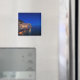 Aimant photo souvenir avec la petite ville de Manarola, l'une des cinq célèbres villages de la colline des Cinque Terre, construite sur une falaise surplombant la mer Méditerranée, avec les lumières allumées pendant l'Heure Bleue au début de la nuit en Ligurie, Italie.