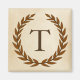 Une délicate couronne de laurier est posée sur un arrière - plan de papier parchemin dans le style romain classique. Ce design est personnalisé avec le monogramme "T" dans une tonalité de sienne riche.