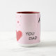 Une jolie photo silhouette d'un homme tenant un enfant en haut, est présentée sur cette mug combo pour Fête des pères. Avec le message, "Coeur rouge (amour) You Dad", mug est rose et blanc à l'extérieur et à l'intérieur de la tasse et la poignée sont rouge profond. Mug est micro-ondes et lave-vaisselle sûr aussi! Un grand cadeau pour papa lors de sa journée spéciale !