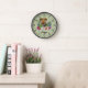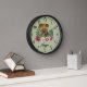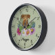 Desteis originelle Cartoon-Illustration eines bezaubernden Airedale Terrier-Hundes, nah aufgereiht, umgeben von farbenfrohen sommerlichen Wildblumen. Es gibt eine rot-rosa Blume, eine lila Blume, eine dunkelrosa Blume und eine weiße, dunkle Blume mit grünen Blätter und Ästen. Die Hintergrundfarbe ist grün mit einem hellen Polka-Punktmuster. Die Hintergrundfarbe kann auf eine andere Farbe geändert werden, und das Polka Punktmuster kann nach Wunsch entfernt werden. Die Stunden sind mit Zahlen markiert. Die Stunden und Minuten werden mit einer gepunkteten Uhr angezeigt. Es gibt auch einen personalisierbaren Textbereich für einen Namen oder einen anderen benutzerdefinierten Text in einem schönen Skript-Schriftart.