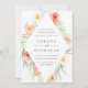 Faire-part de mariage floral moderne dans des aquarelles pastel clair, avec une bordure géométrique en losange de fleurs peintes en vert pêche pâle et menthe, avec vos détails mariages en lettrage gris doux.