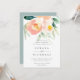 Faire-part de mariage floral moderne aux aquarelles pastel, avec un bouquet surdimensionné de fleurs peintes en vert pêche pâle et menthe, avec vos détails mariages en gris doux.